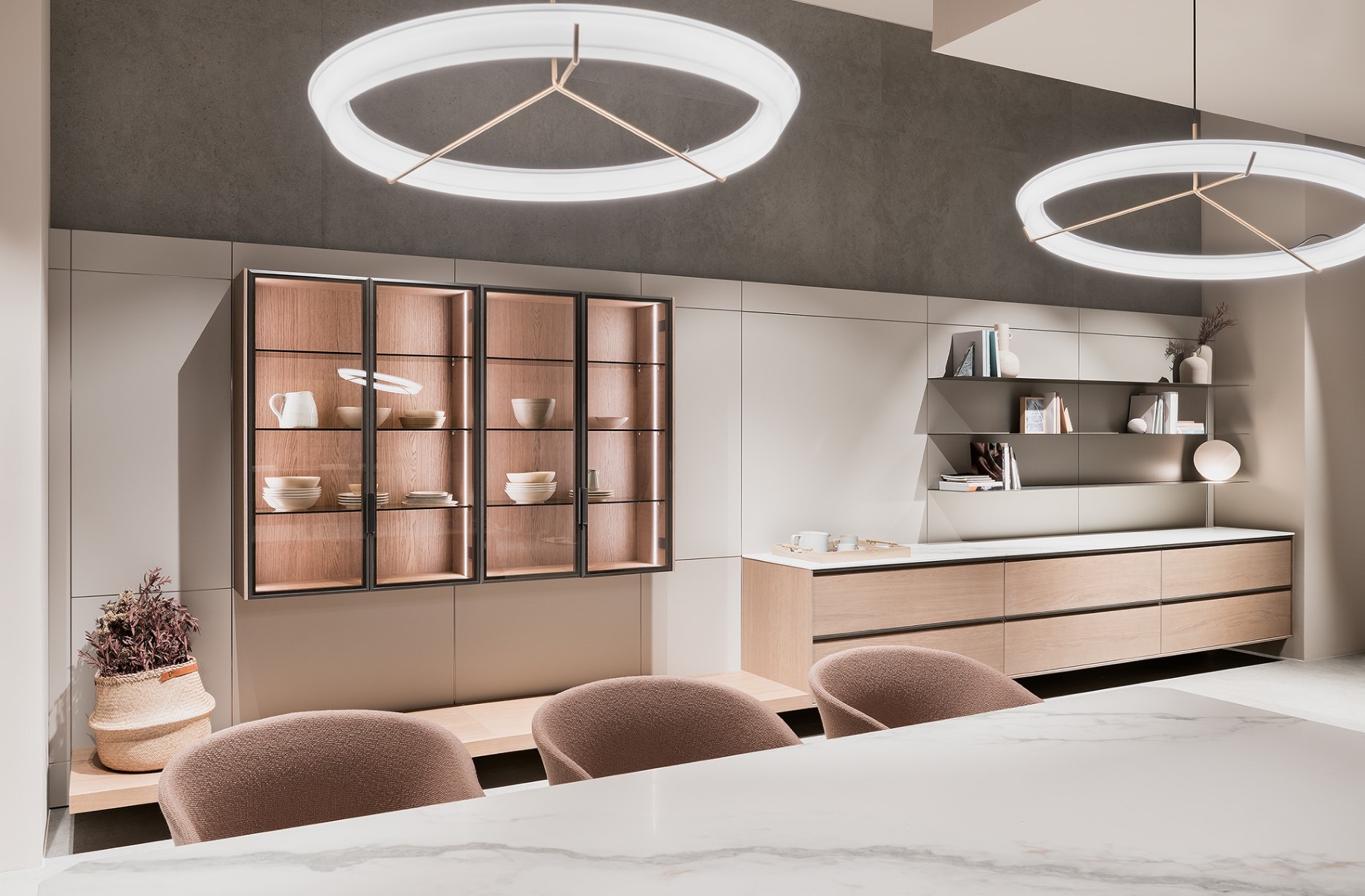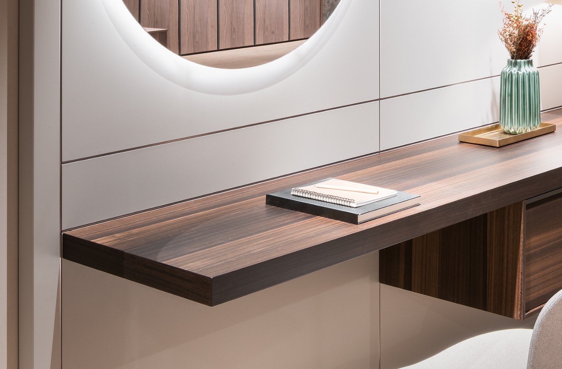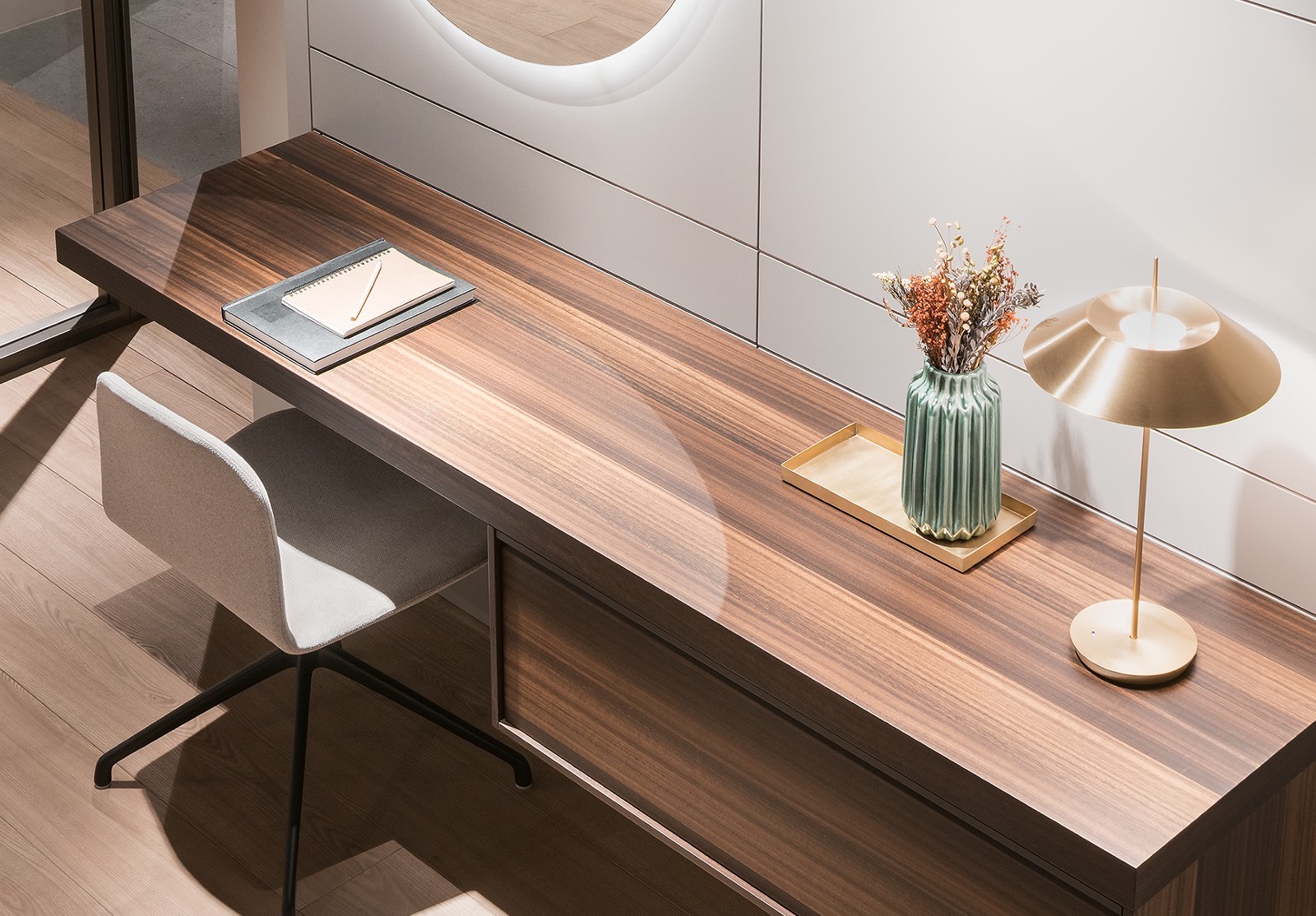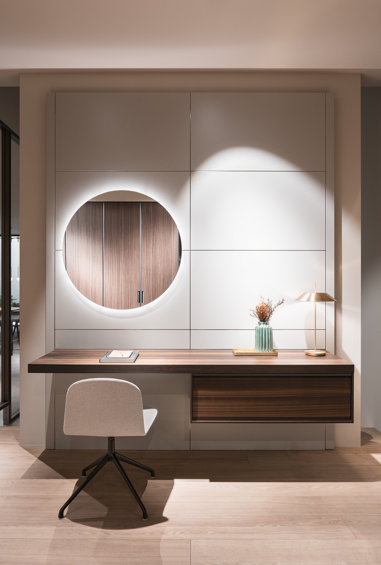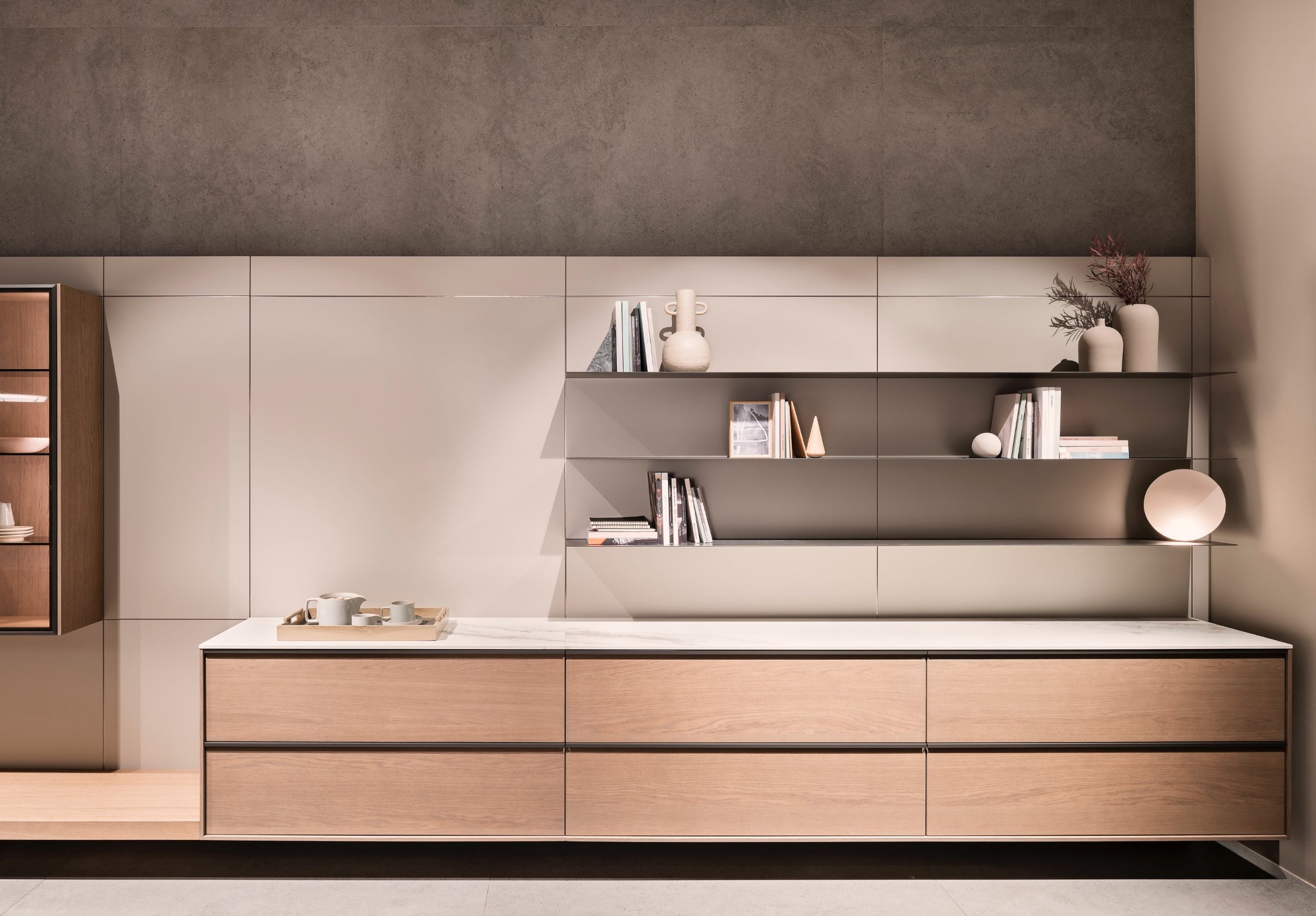 Los perfiles estructurales de la Pared Equipada permiten un sinfín de posibilidades estéticas y la máxima calidad funcional. El mueble suspendido y el contraste de los materiales laca Nude con madera de Eucalipto Fumé crea una elegante zona de escritorio.