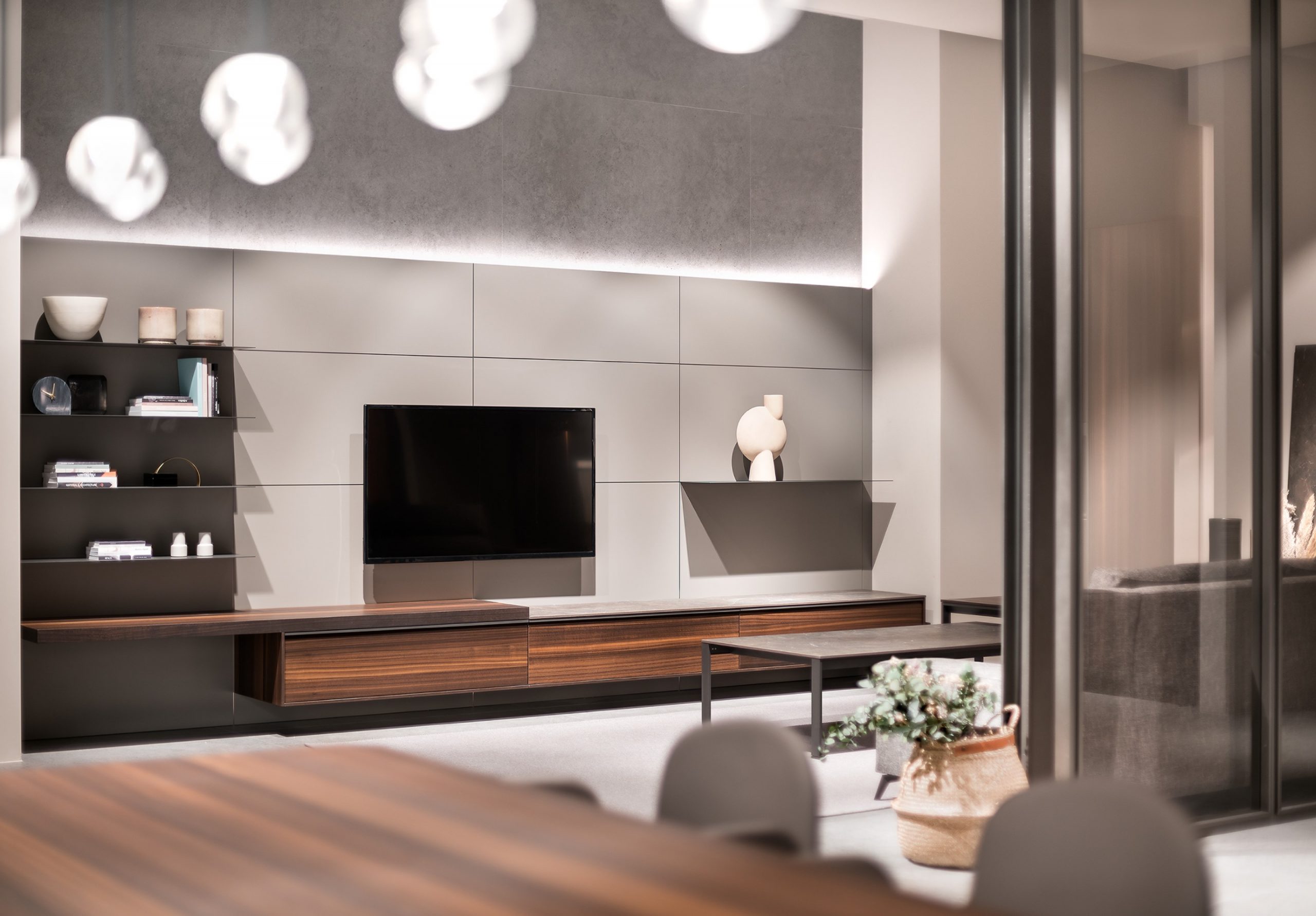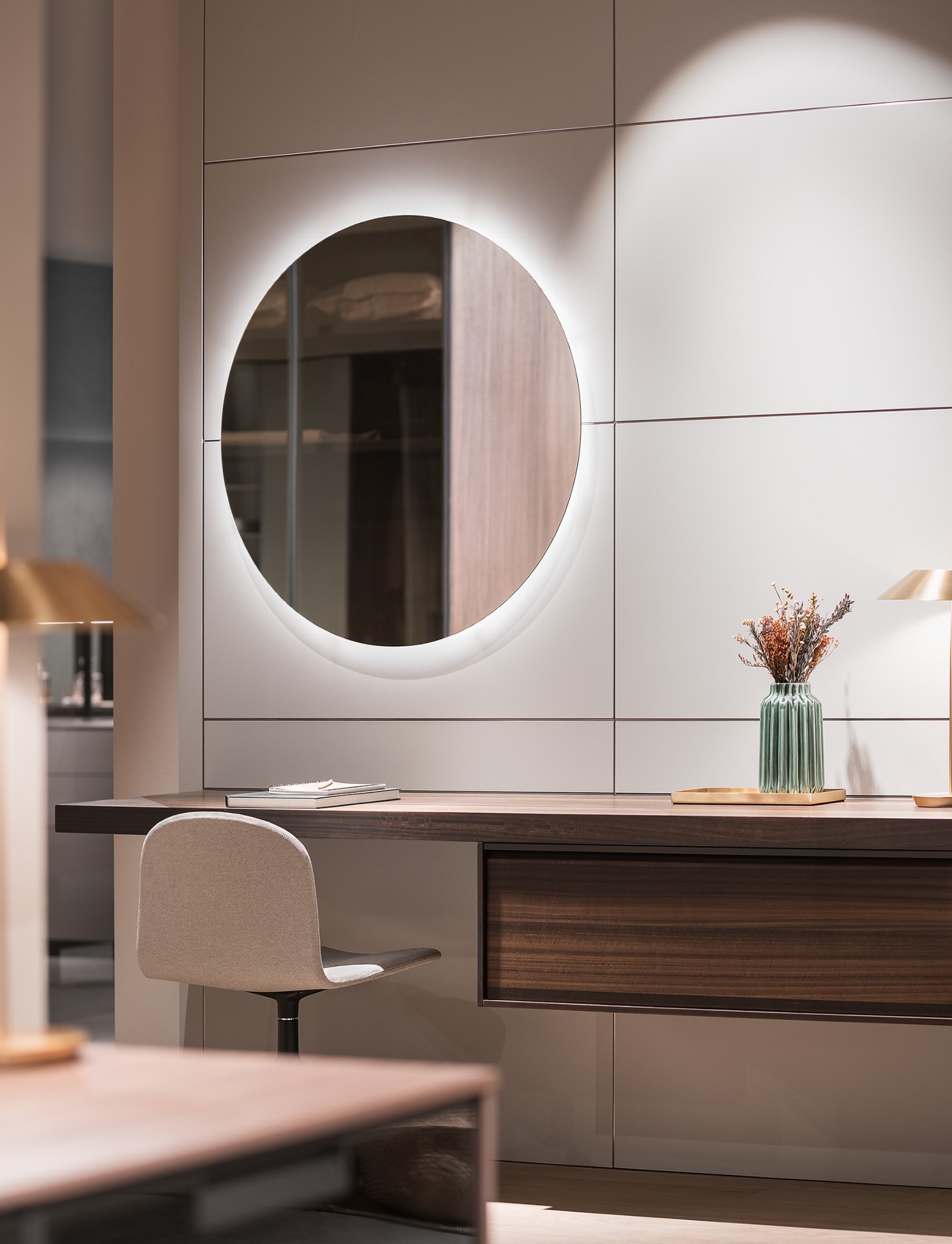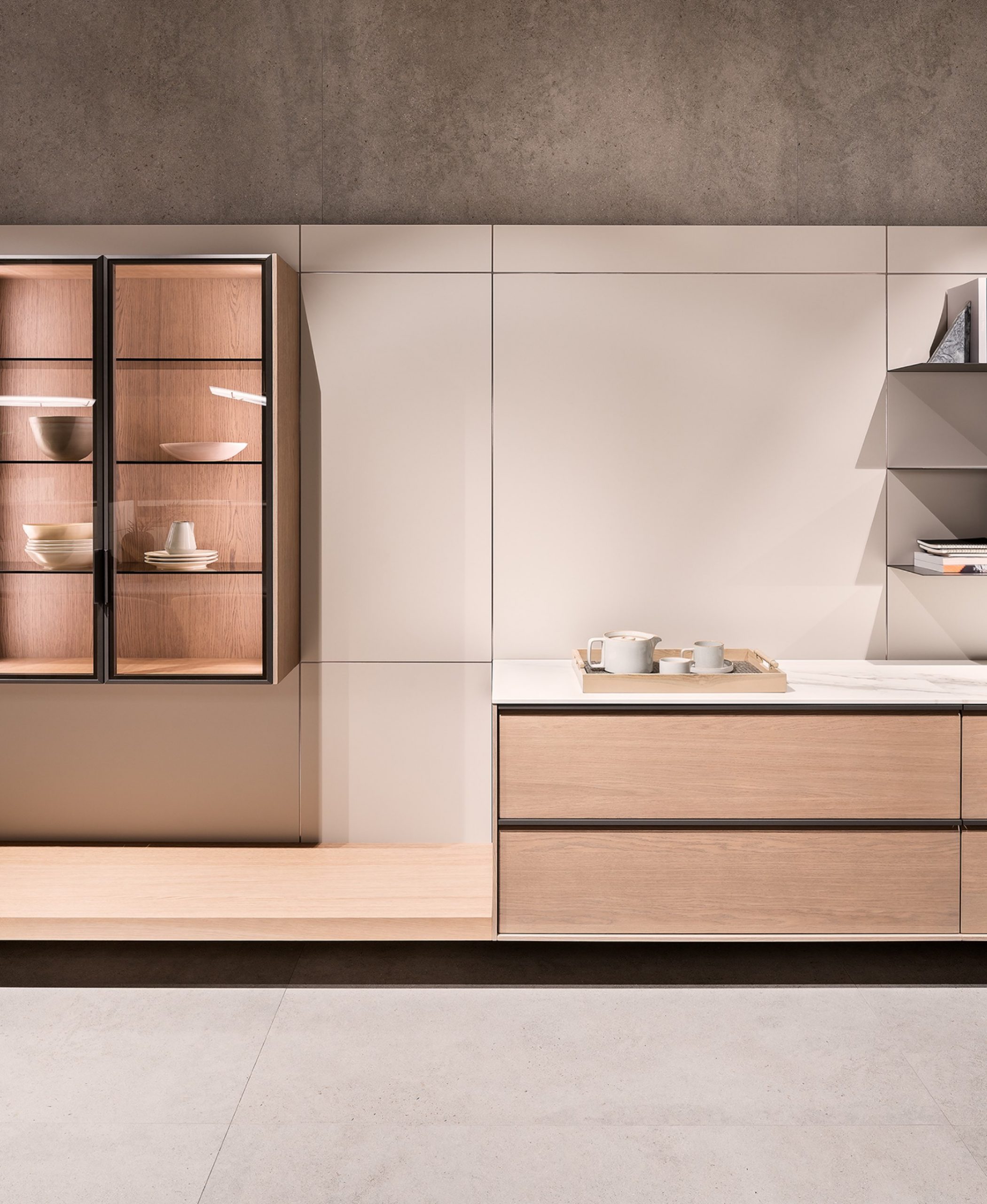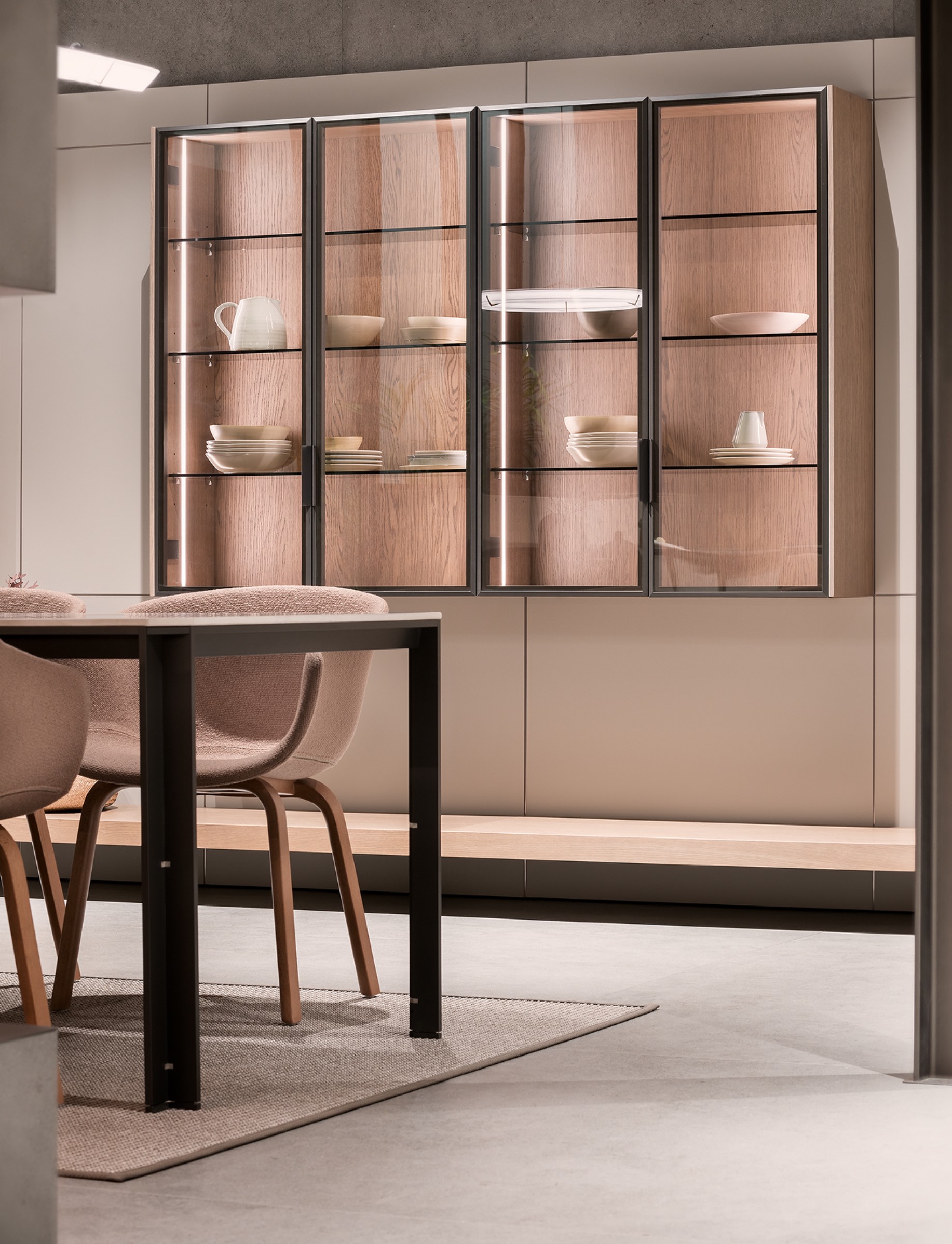 Los perfiles estructurales de la Pared Equipada permiten un sinfín de posibilidades estéticas y la máxima calidad funcional. El mueble suspendido y el contraste de los materiales laca Nude con madera de Eucalipto Fumé crea una elegante zona de escritorio.