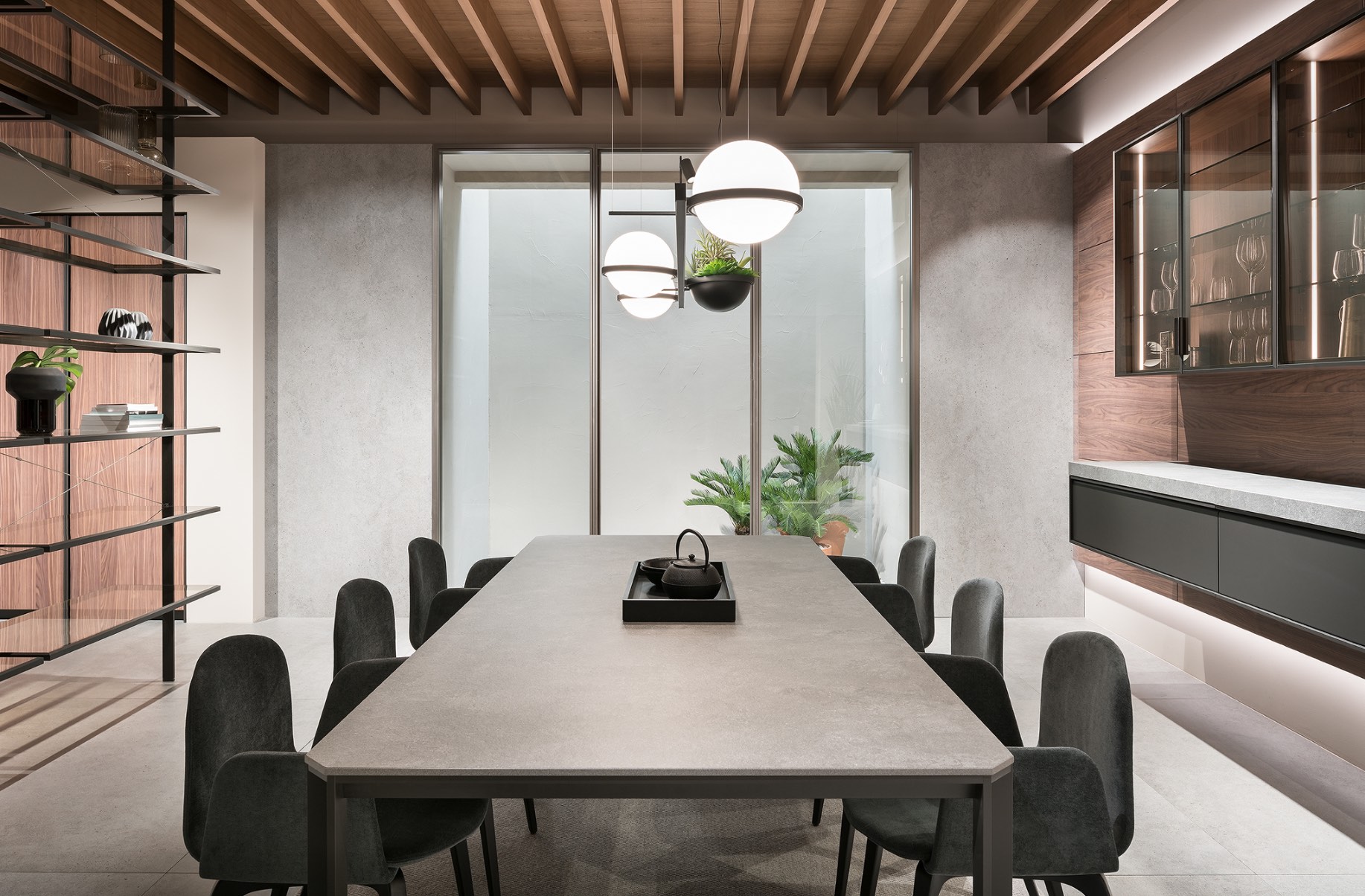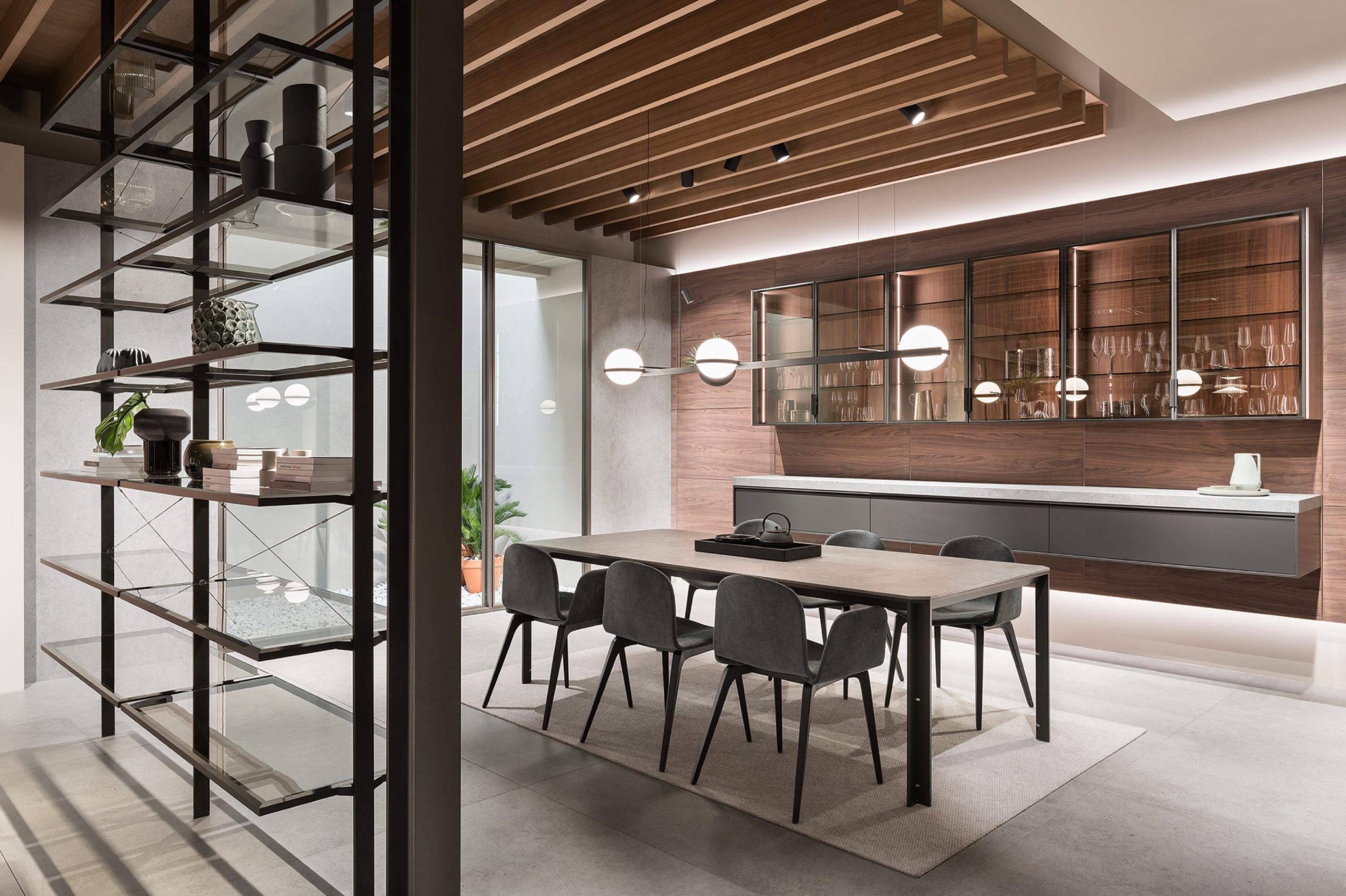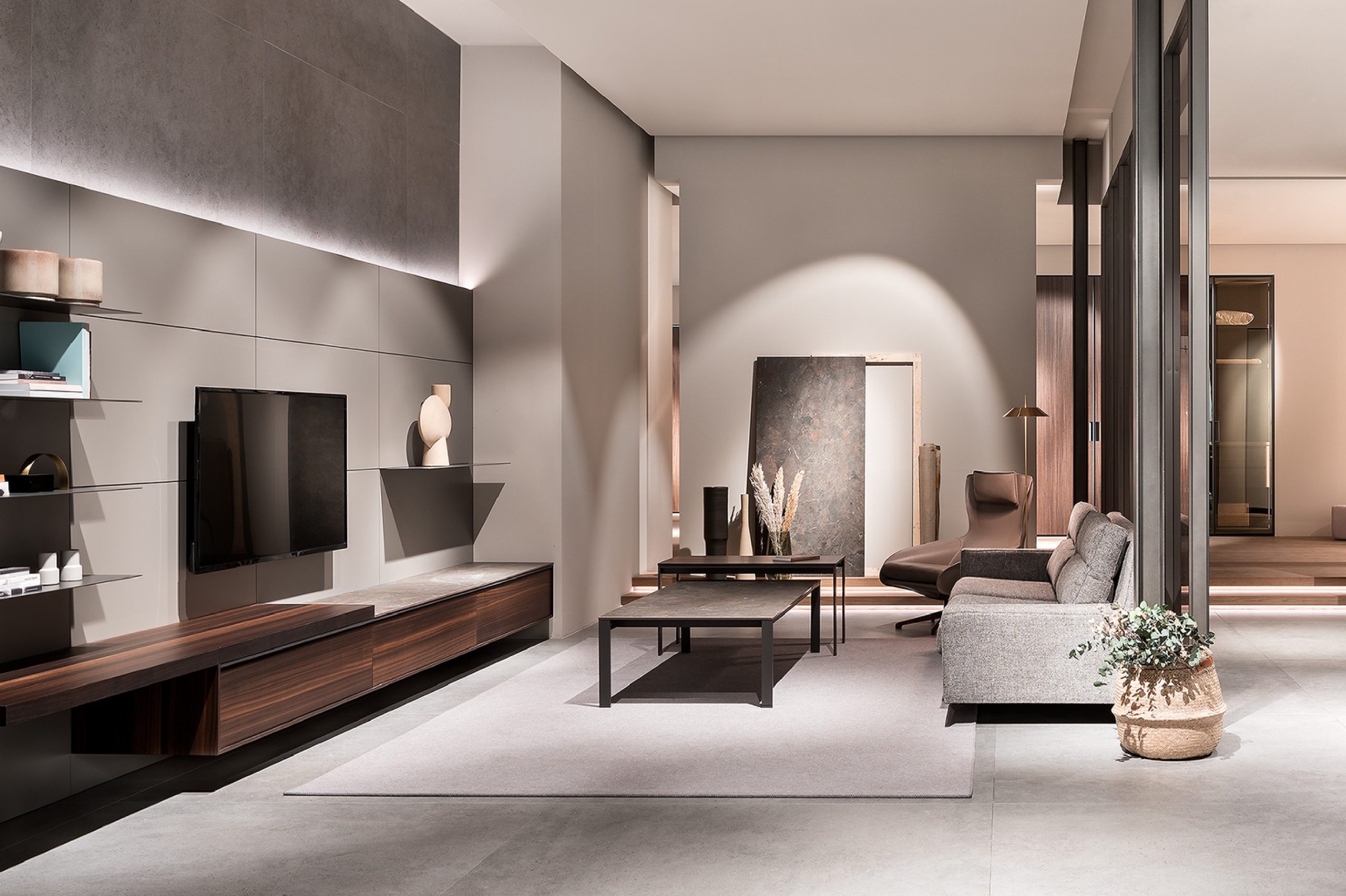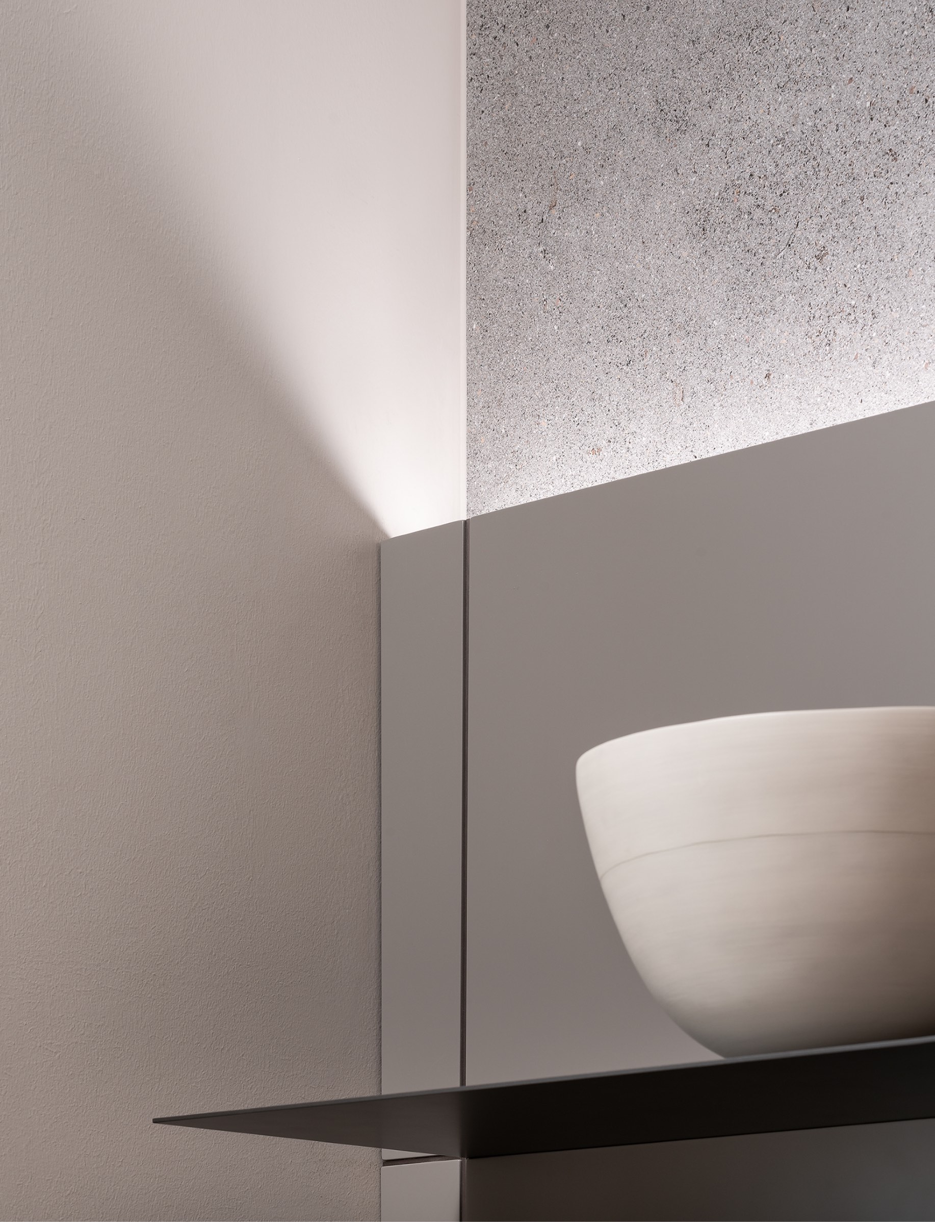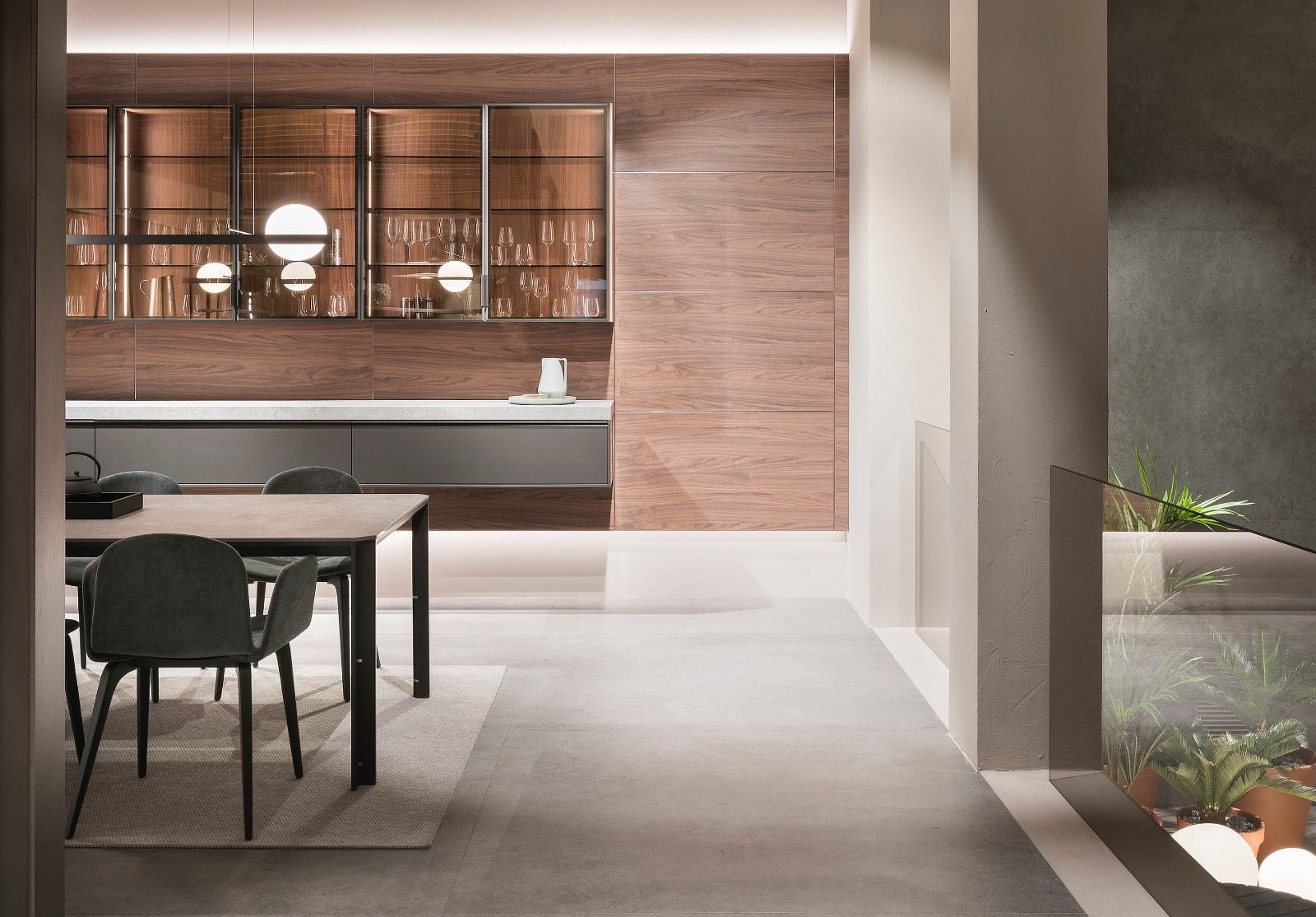 Los perfiles estructurales de la Pared Equipada permiten un sinfín de posibilidades estéticas y la máxima calidad funcional. El mueble suspendido y el contraste de los materiales laca Nude con madera de Eucalipto Fumé crea una elegante zona de escritorio.